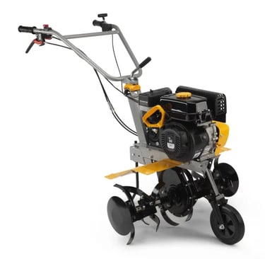 Motoazada con motor de gasolina de 182 cc, 60 cm de anchura de trabajo, seis rotores metálicos y una rueda delantera.
